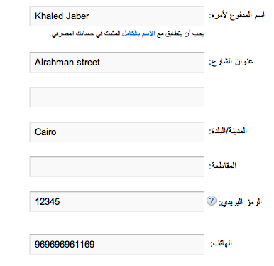 كيفية إدخال اسم المدفوع لأمره والعنوان التابعين لي؟