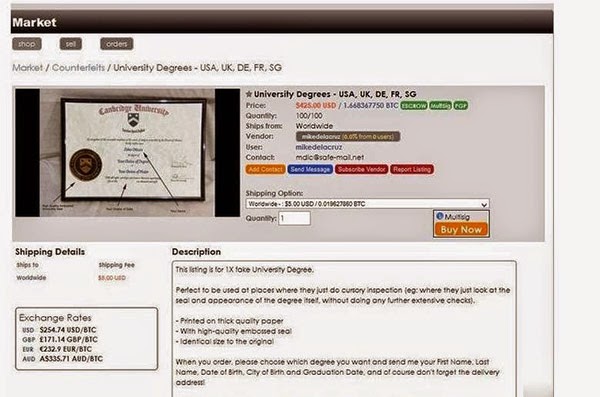 يمكنك أيضا الحصول على شهادات مزورة احترافية ومتقنة في الويب العميق بما لا يزيد عن 250 دولار فقط .بمعنى يمكنك الحصول على شهادة جامعية من هارفارد :)